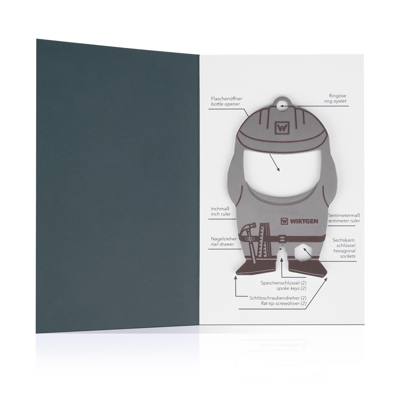 konstruierter Flaschenöffner inkl. WIRTGEN Logo löst problemlos jeden Kronkorken und mit 8 weiteren nützlichen Funktionen wird er schnell zum unverzichtbaren