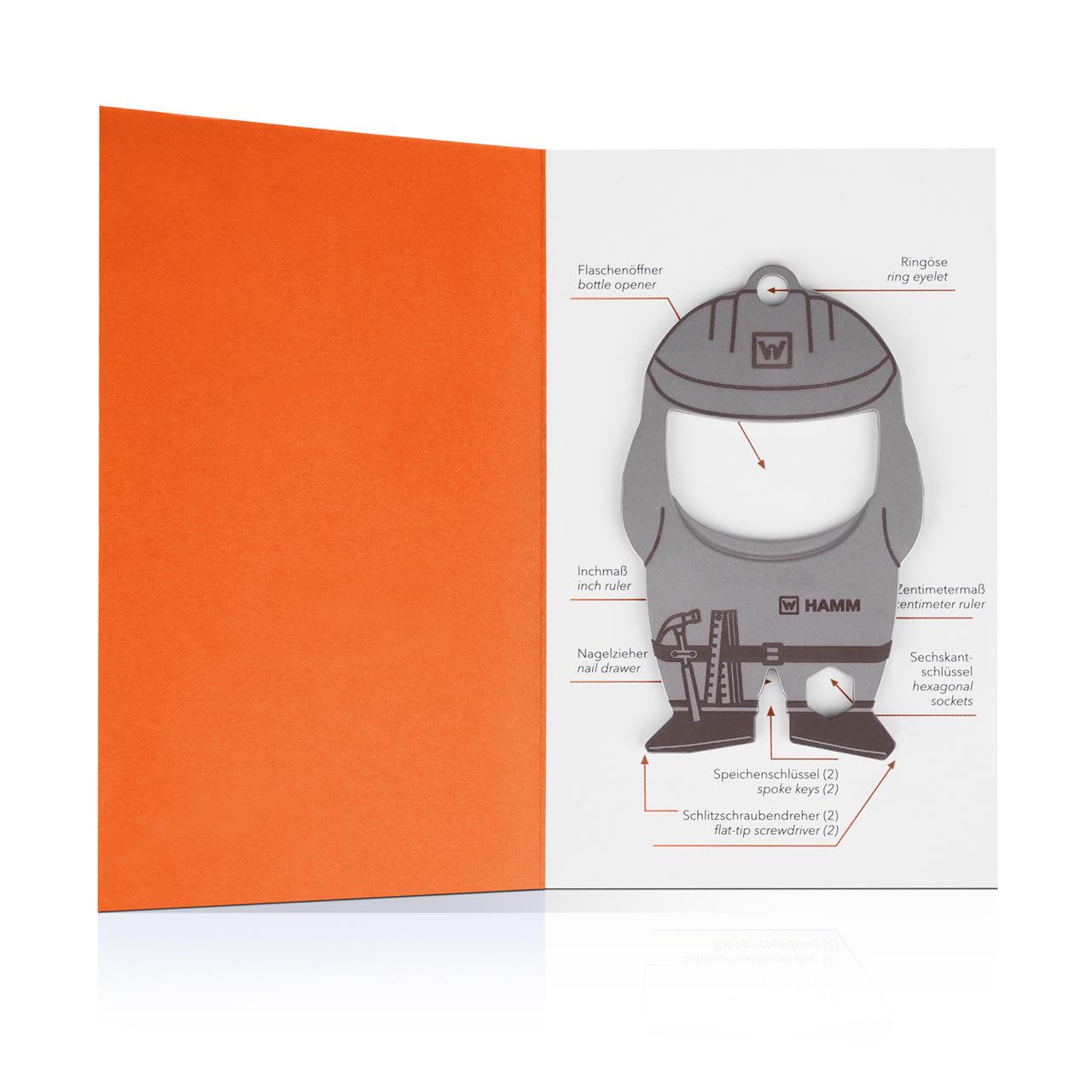 konstruierter Flaschenöffner inkl. HAMM Logo löst problemlos jeden Kronkorken und mit 8 weiteren nützlichen Funktionen wird er schnell zum unverzichtbaren