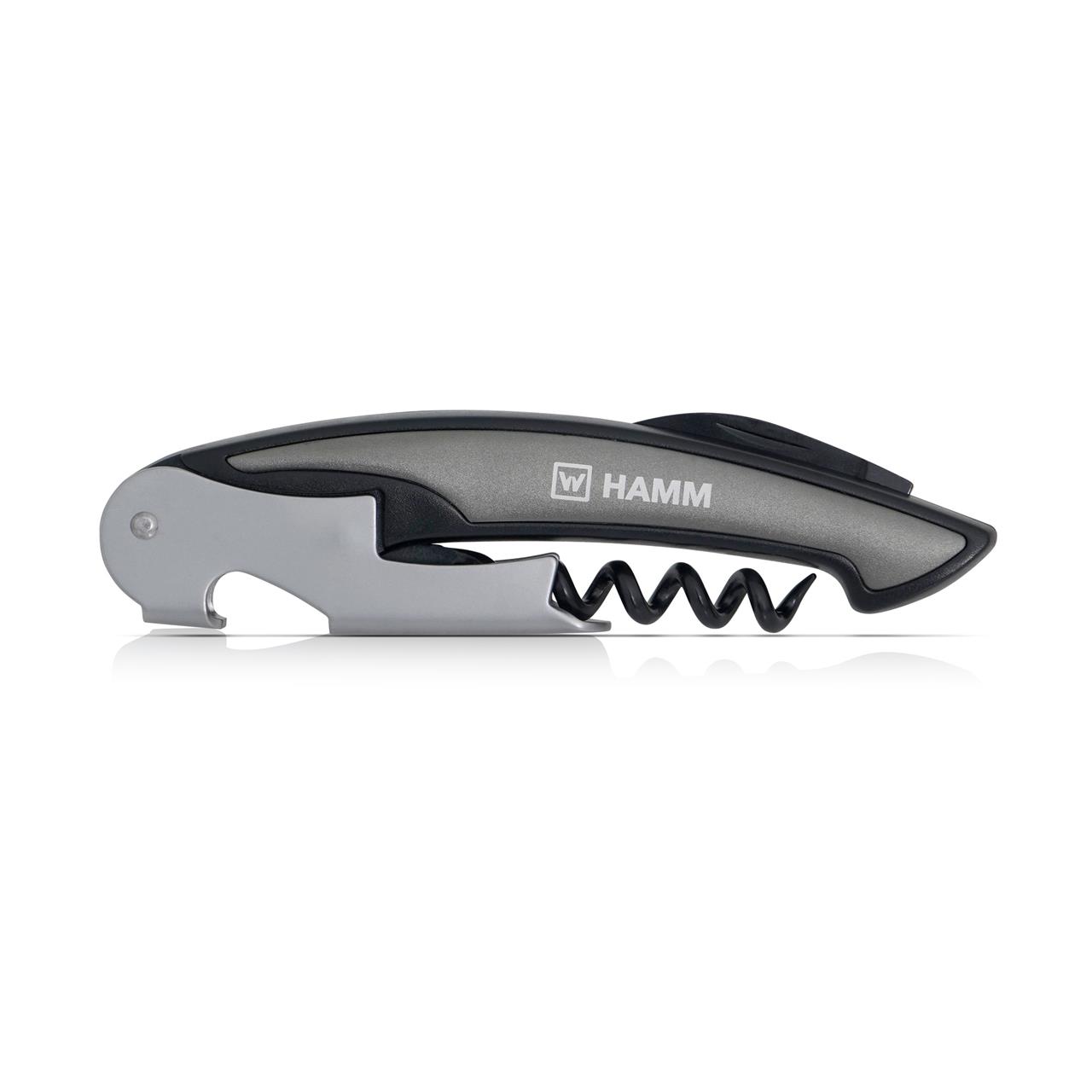 Open wine bottles with corks like a pro! The high-quality sommelier knife with HAMM logo made of aluminum and stainless steel has a cap lifter, knife (foil cutter), spindle (corkscrew) and lever. The spindle is made of stainless steel, so it is suitable for synthetic and natural corks.