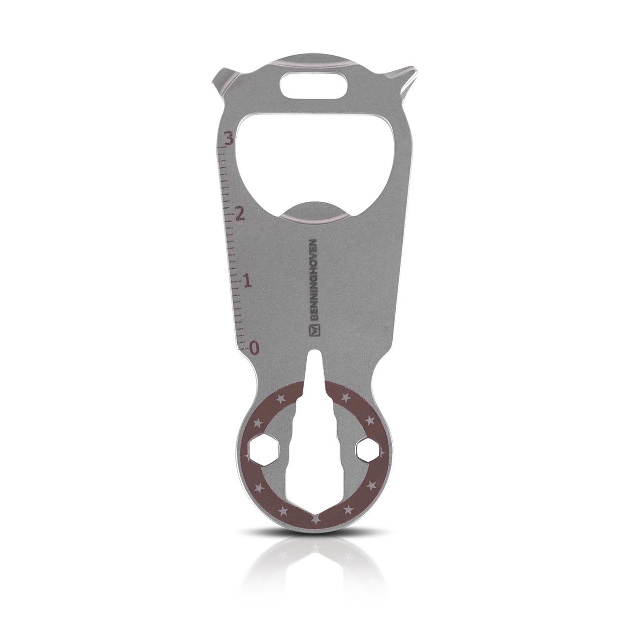 The small and compact multifunctional tool with integrated trolley key made of high quality matt finished stainless steel and BENNINGHOVEN logo will be an indispensable companion and fits every key ring. 14 functions on smallest space satisfy nearly every need: practical trolley key, cap lifter, two flat-tip screwdriver, Philllips screwdriver, six hexagonal sockets, two rulers (inch and centimeter), nail drawer.