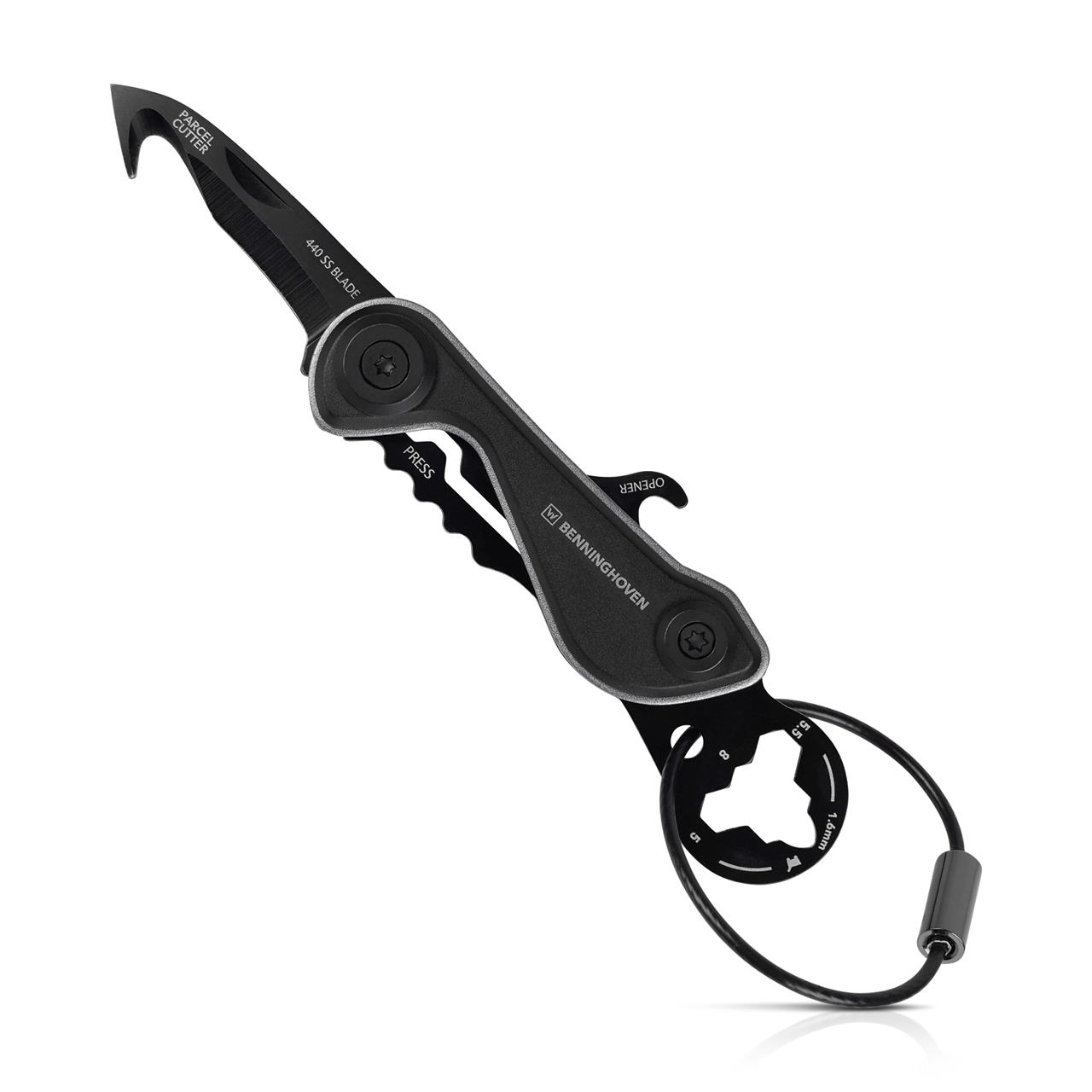 The mini tool combines a The mini tool combines a total of nine functions. It is a shopping cart remover, parcel knife + blade made of 440 stainless steel with snap-in function, key ring (wire loop), bottle opener, hexagon wrench (3 sizes) and tire tread depth gauge (1.6 mm) all in one. It fits in every trouser pocket and is therefore the perfect companion for every day. The tool is made of 440 stainless steel / aluminum. of nine functions. It is a shopping cart remover, parcel knife + blade made of 440 stainless steel with snap-in function, key ring (wire loop), bottle opener, hexagon wrench (3 sizes) and tire tread depth gauge (1.6 mm) all in one. It fits in every trouser pocket and is therefore the perfect companion for every day. The tool is made of 440 stainless steel / aluminum.