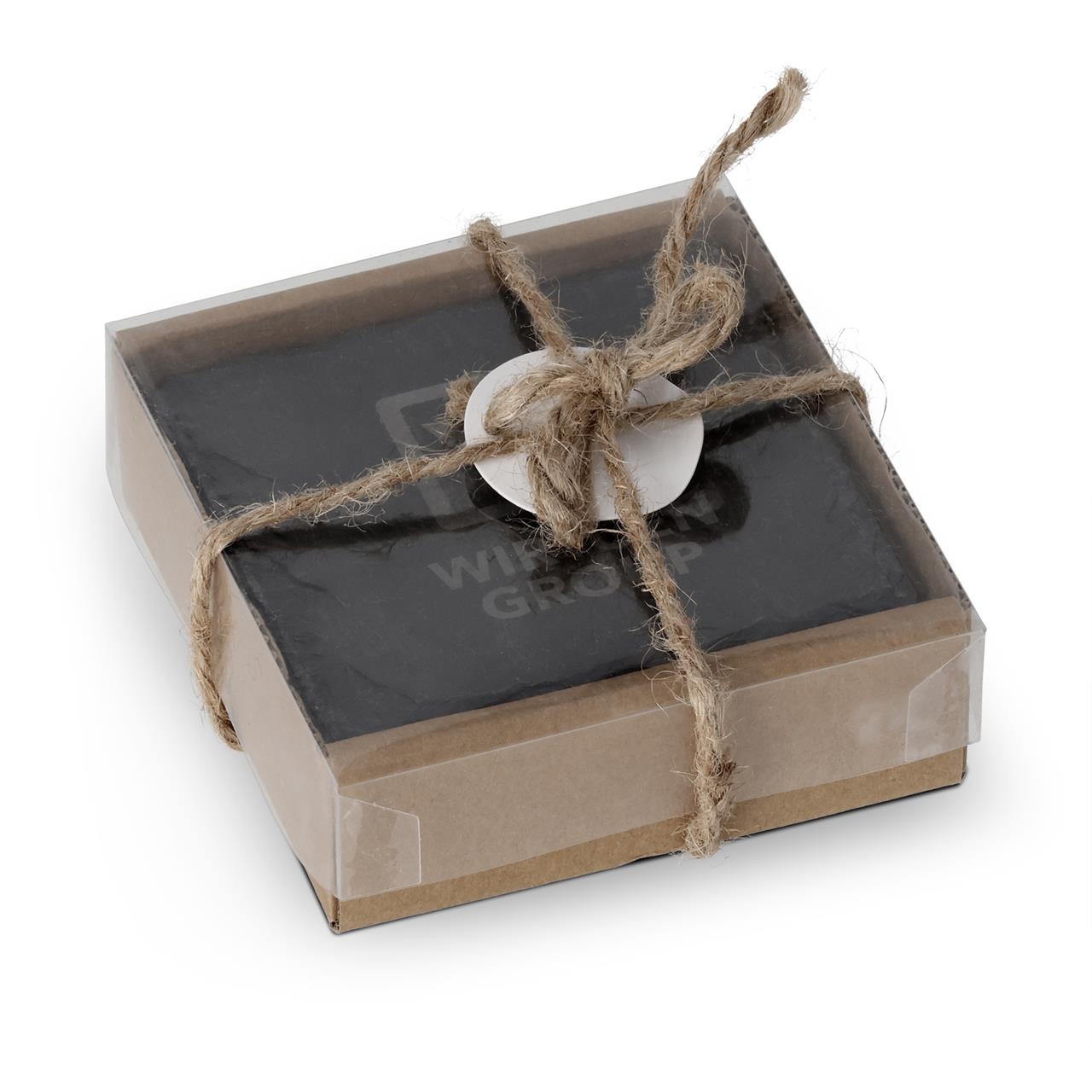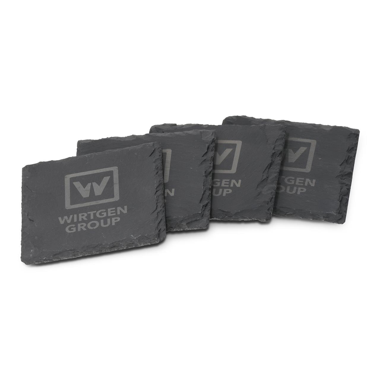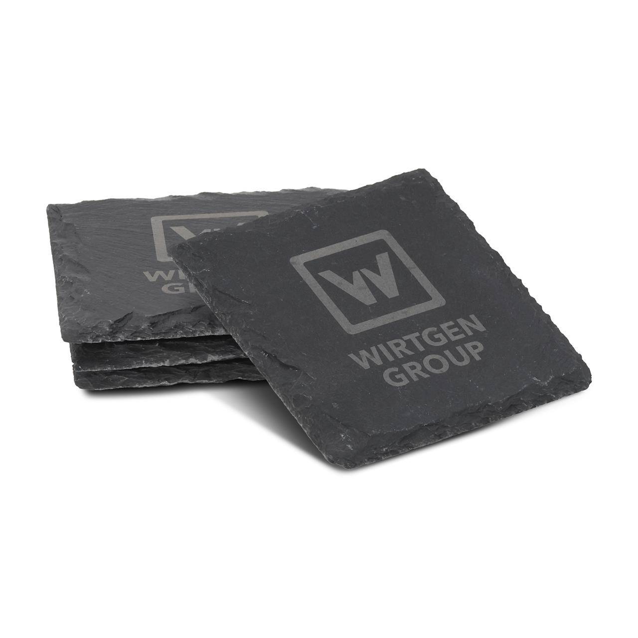 The four coasters, measuring 10 x 10 x 0.3 cm, are made of slate and engraved with the WIRTGEN GROUP logo. To prevent scratches on the table, each coaster also has EVA feet on the underside. The coasters are packaged as an attractive gift set.