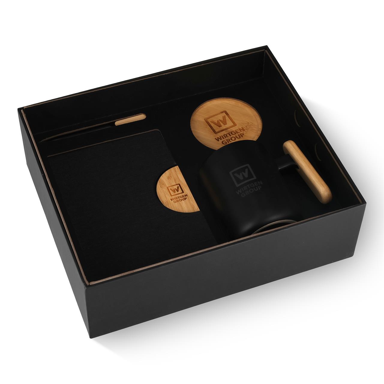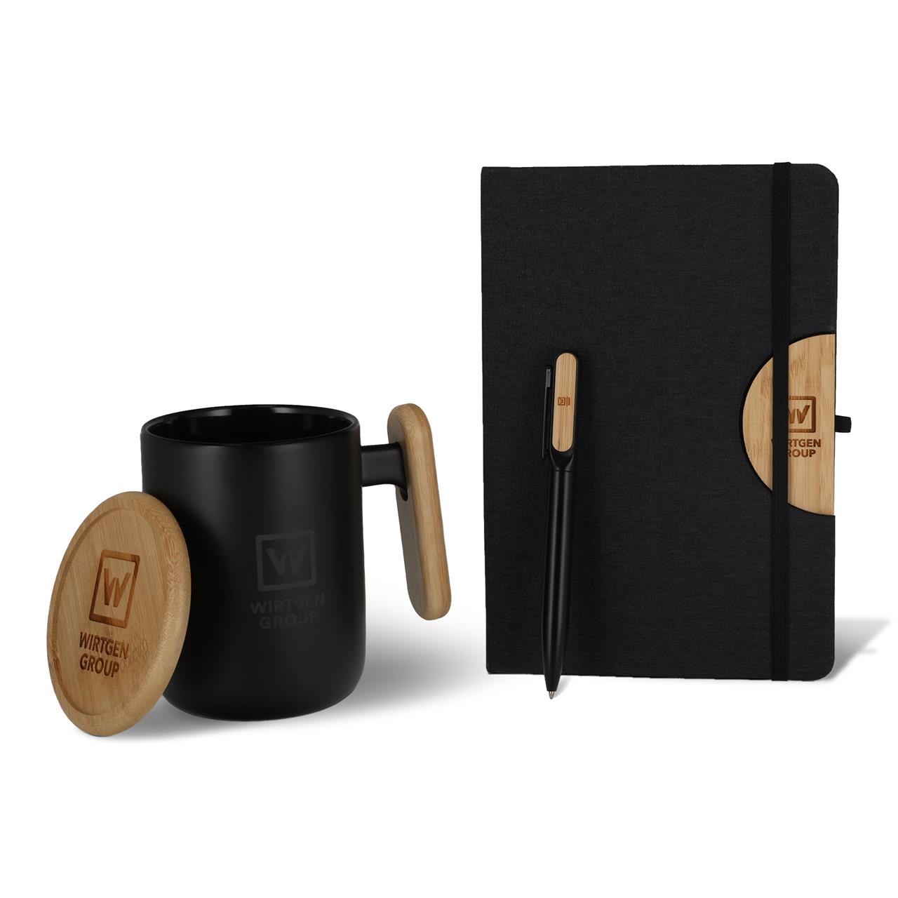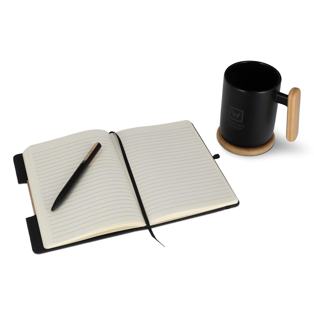 Das Set enthält ein Hardcover Notizbuch aus RPET im Format A5, einen Kugelschreiber, eine Keramiktasse und einen Untersetzer. Das Notizbuch ist mit einem elastischen Verschluss und Lesebändchen versehen und besteht aus 80 Blatt liniertem, cremefarbenem 80 g/m² Papier. Die Notizbuchhülle dient zusammen mit dem Halbkreis aus Bambus als Telefonhalterung. Der Kugelschreiber besteht aus RCS-zertifiziertem recyceltem Aluminium mit schwarzer Pulverbeschichtung und Bambusaccessoires auf beiden Seiten des oberen Schaftes. Tinte: Schwarz. Die Keramiktasse mit einem Fassungsvermögen von 480 ml wird mit einem Untersetzer aus Bambus geliefert. Nur von Hand reinigen. Die gesamte Geschenkbox hat die Maße 32 x 27 x 10,3 cm.