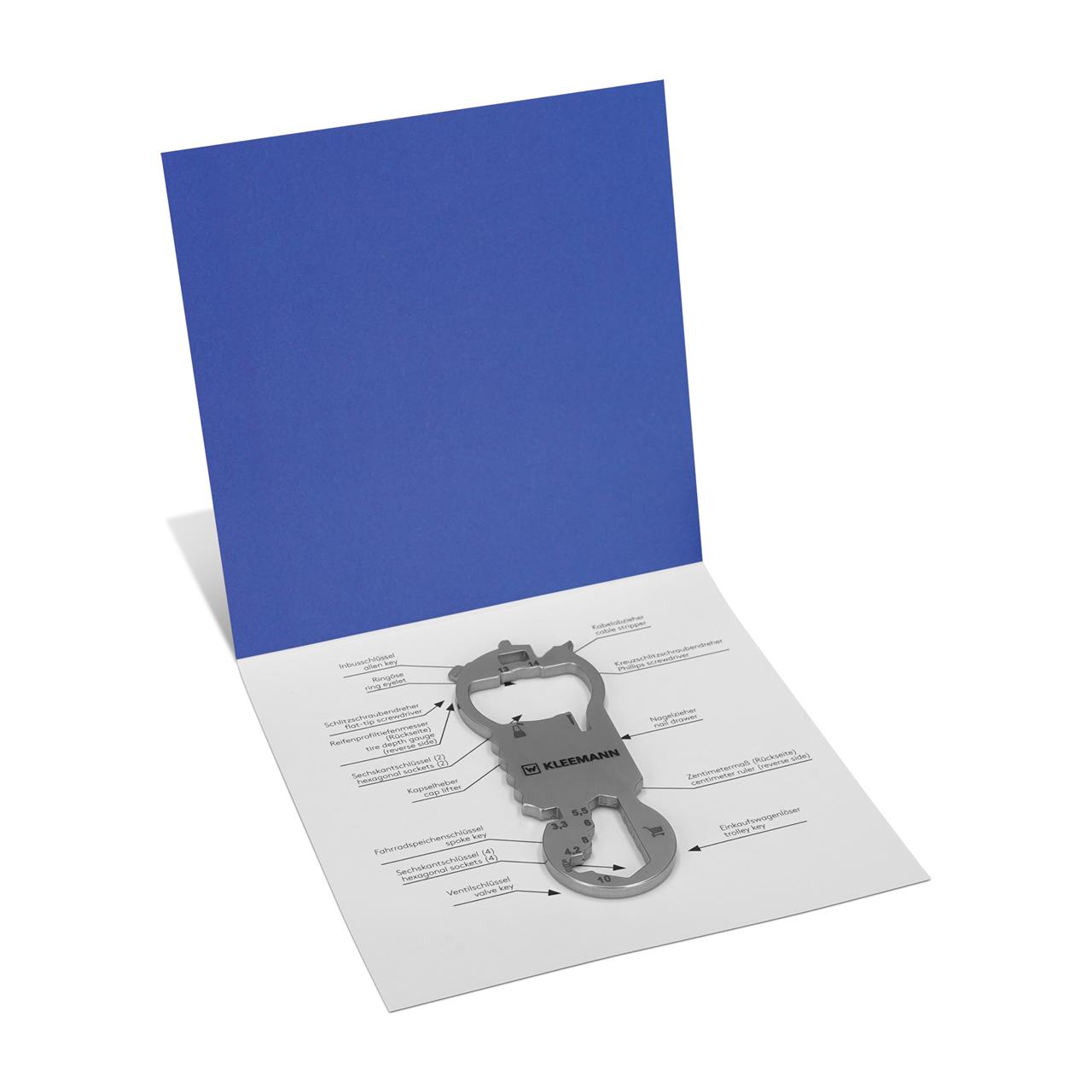 KEY TOOL Bike "KLEEMANN" is a compact multi-function tool designed for cycling tours and everyday use. Made of high-quality, matte-finished stainless steel, it stands out for its durability and robustness.