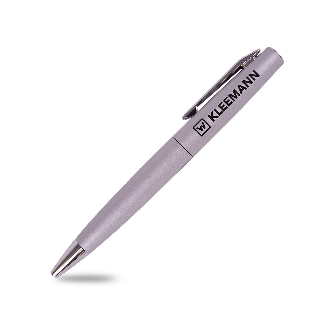 Eleganter Metall-Drehkugelschreiber in silber mit blau schreibender Metall- Großraummine. Die glanzverchromten Elemente verleihen diesem Kugelschreiber eine edle Note. Das schwarze KLEEMANN Logo sorgt für einen modernen Look.