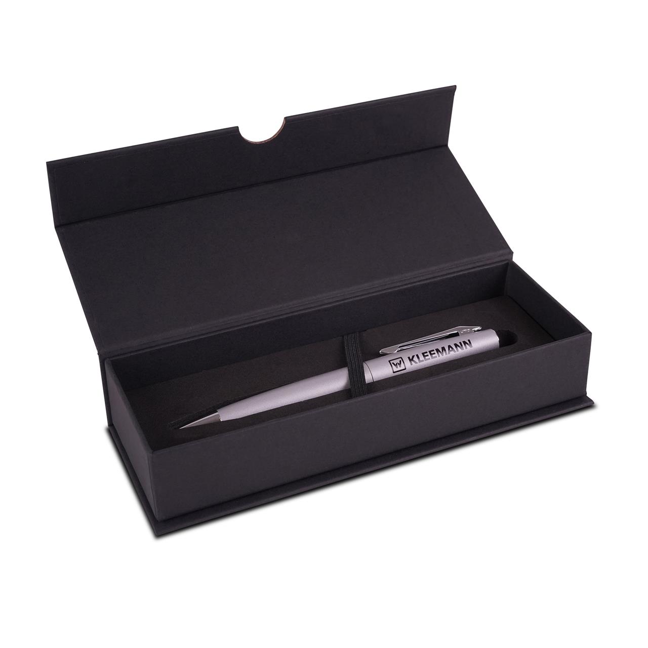Eleganter Metall-Drehkugelschreiber in silber mit blau schreibender Metall- Großraummine. Die glanzverchromten Elemente verleihen diesem Kugelschreiber eine edle Note. Das schwarze KLEEMANN Logo sorgt für einen modernen Look.